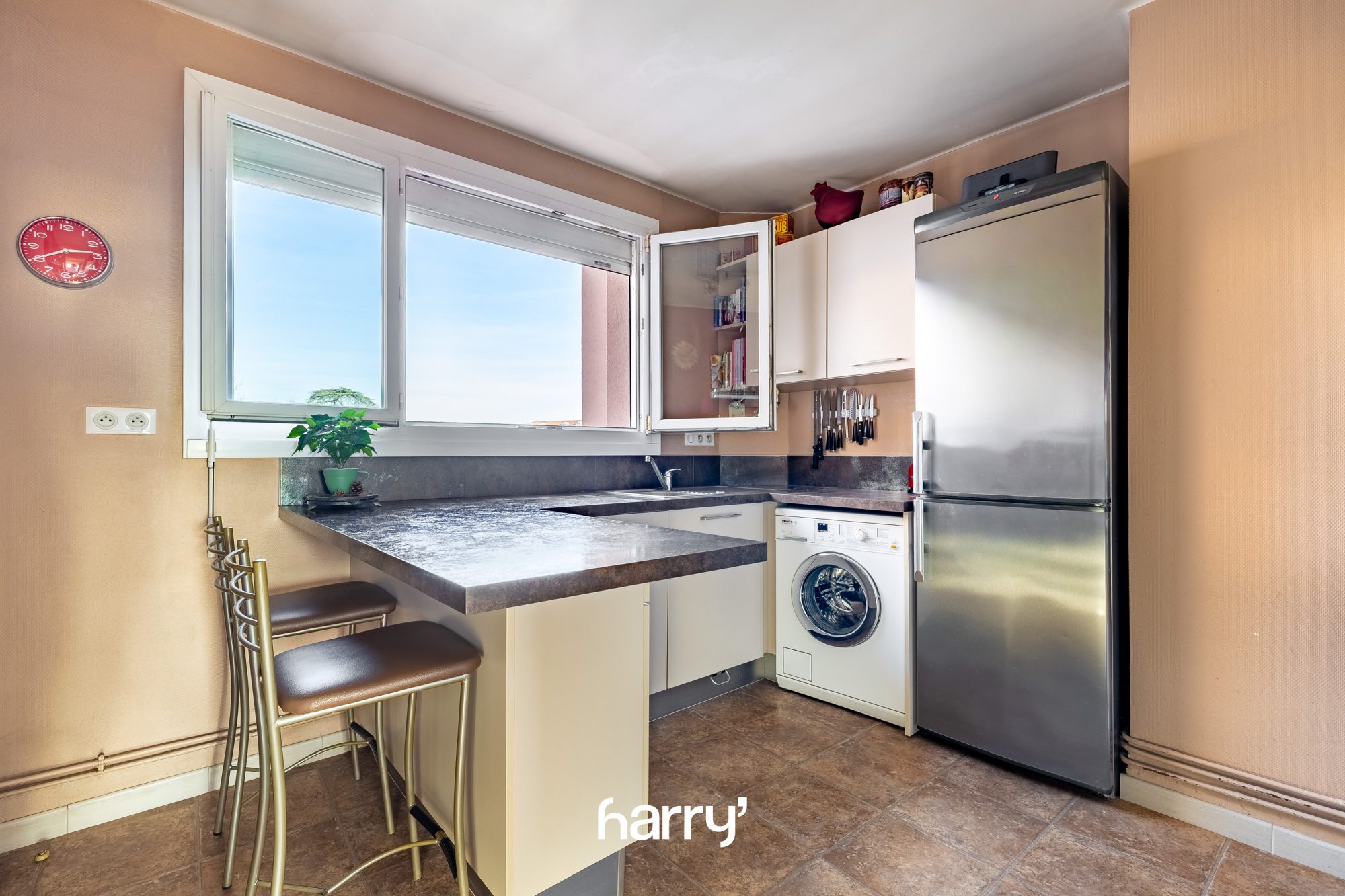 Une cuisine entièrement équipée et avec beaucoup de rangements communique avec cette pièce à vivre.